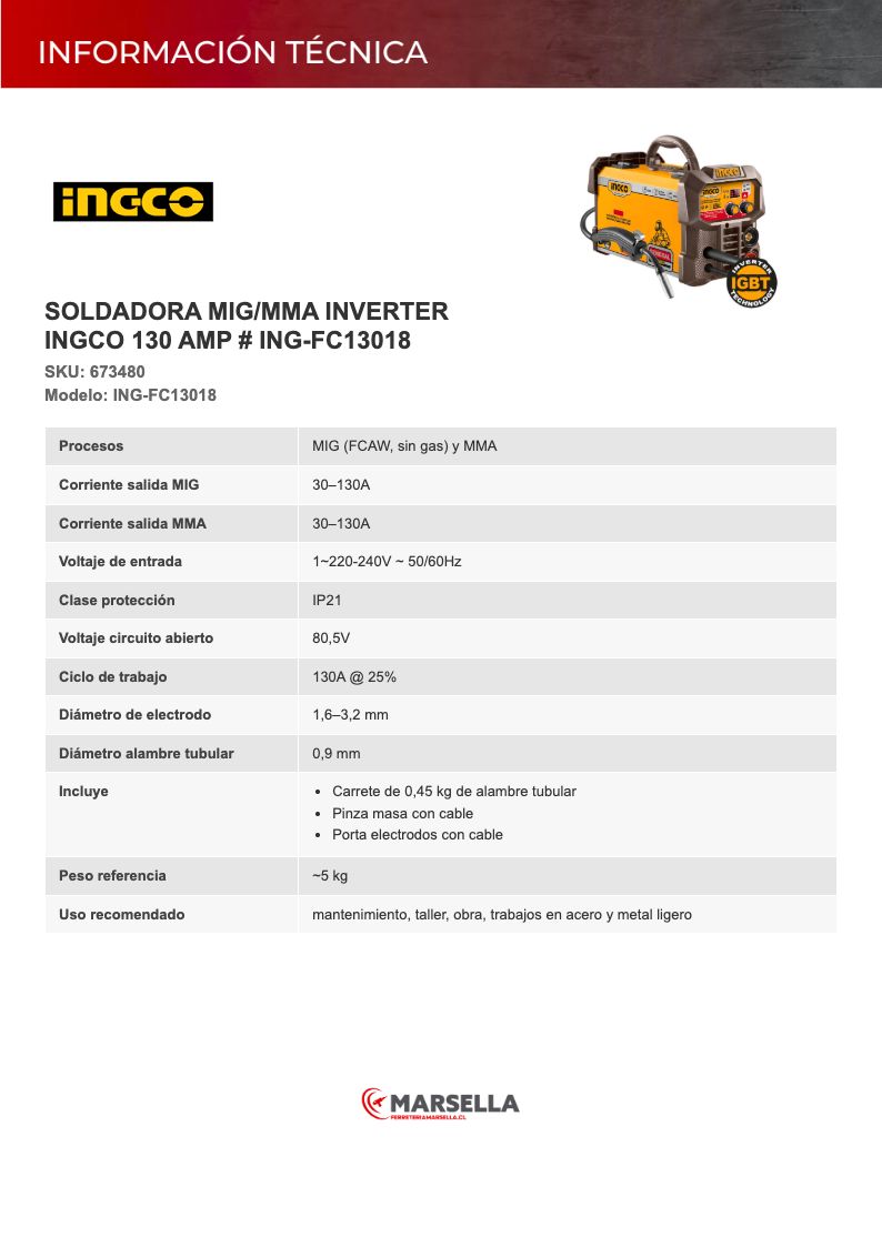 Soldadora inverter INGCO FC13018 para procesos MIG (FCAW, sin gas) y MMA (electrodos), compacta, robusta y de fácil operación. Ideal para reparaciones, mantenimiento, talleres y uso doméstico. Incluye carrete de alambre tubular, pinza de masa, pinza porta electrodos y cable.
