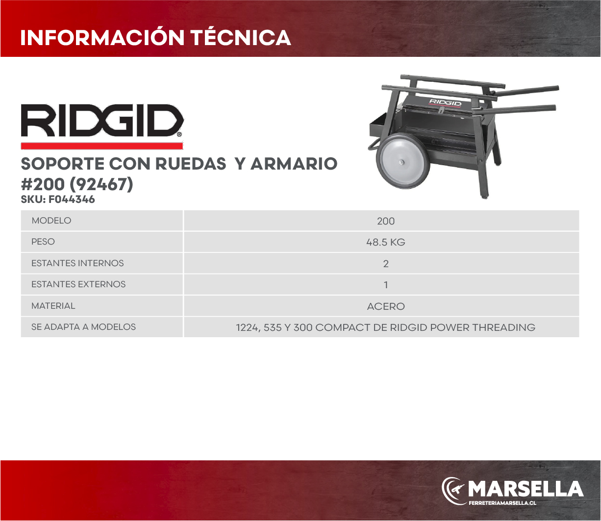 El Soporte con Ruedas y Armario RIDGID 200 est diseado para brindar una base mvil, robusta y segura para equipos de roscado y herramientas pesadas. Su diseo incluye ruedas industriales para fcil transporte y un armario inferior metlico con cerradura que ofrece almacenamiento seguro para accesorios y herramientas. Ideal para talleres exigentes y entornos industriales.