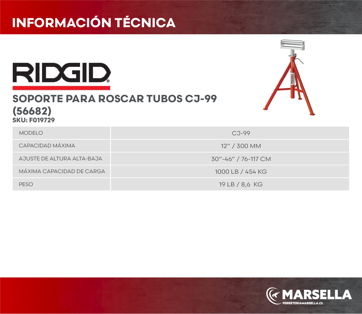 El Soporte para Roscar Tubos CJ RIDGID es un accesorio de apoyo confiable y resistente, ideal para trabajos de roscado, corte o ensamblaje de caeras. Diseado para brindar un soporte firme y seguro, este modelo se distingue por su capacidad de carga y estructura robusta. Es compatible con una amplia gama de herramientas roscadoras RIDGID y otros equipos similares, convirtindolo en un aliado esencial en instalaciones de plomera e industria.