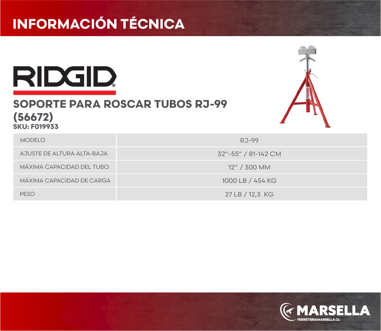 El Soporte para Roscar Tubos RJ RIDGID es un accesorio robusto y prctico, diseado para brindar estabilidad y soporte durante el proceso de roscado, corte o ensamblaje de caeras. Su estructura resistente soporta tuberas de gran longitud y peso, facilitando el trabajo con herramientas roscadoras como la RIDGID 300, 535 o similares. Ideal para talleres, obras y aplicaciones industriales donde la precisin y seguridad son clave.