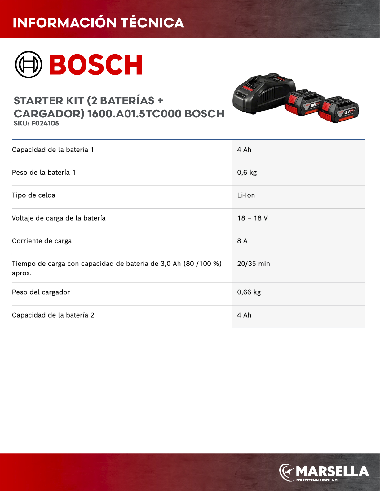 El Starter Kit Bosch 1600.A01.5TC-000 incluye dos baterías recargables y un cargador rápido diseñado para herramientas eléctricas Bosch. Este kit es ideal para profesionales y aficionados que buscan prolongar el tiempo de trabajo sin interrupciones, garantizando un rendimiento óptimo y durabilidad. Las baterías cuentan con tecnología avanzada que proporciona una carga eficiente y una larga vida útil, mientras que el cargador permite recargar las baterías en menor tiempo, maximizando la productividad. Compatible con una amplia gama de herramientas Bosch de la línea de 18V, este kit es el complemento perfecto para mantener tu equipo siempre listo para cualquier tarea.