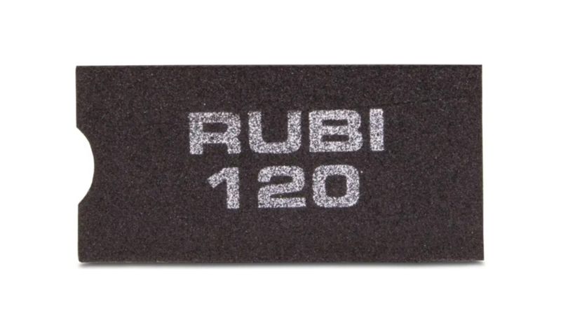 El taco de goma diamantado RUBI grano 120 ref. 61975 es un bloque manual para desbaste y pulido de cantos y superficies de piedra natural y baldosa cerámica, ideal para rectificar bordes después del corte y suavizar pequeños desconchados o aristas vivas. Su cuerpo de goma EVA es semi‑flexible y se adapta ergonómicamente a la mano del usuario, mientras que la superficie diamantada de grano 120 ofrece un poder de desbaste medio, recomendado para igualar y preparar el borde antes de acabados más finos.