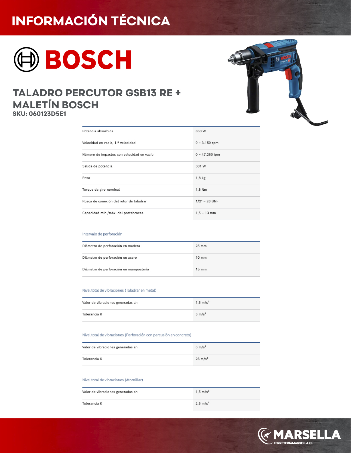 El Taladro Percutor Bosch GSB 13 RE es una herramienta eléctrica compacta y potente, diseñada para perforar con precisión en materiales como madera, metal y mampostería. Con una potencia de 650 W y una velocidad de hasta 3.150 rpm, ofrece un rendimiento eficiente para tareas de bricolaje y trabajos profesionales ligeros. Su diseño ergonómico con mango Softgrip y botón de bloqueo permite un uso prolongado sin generar fatiga. Además, incluye un maletín de transporte que facilita su almacenamiento y traslado, manteniendo la herramienta y sus accesorios organizados y protegidos.