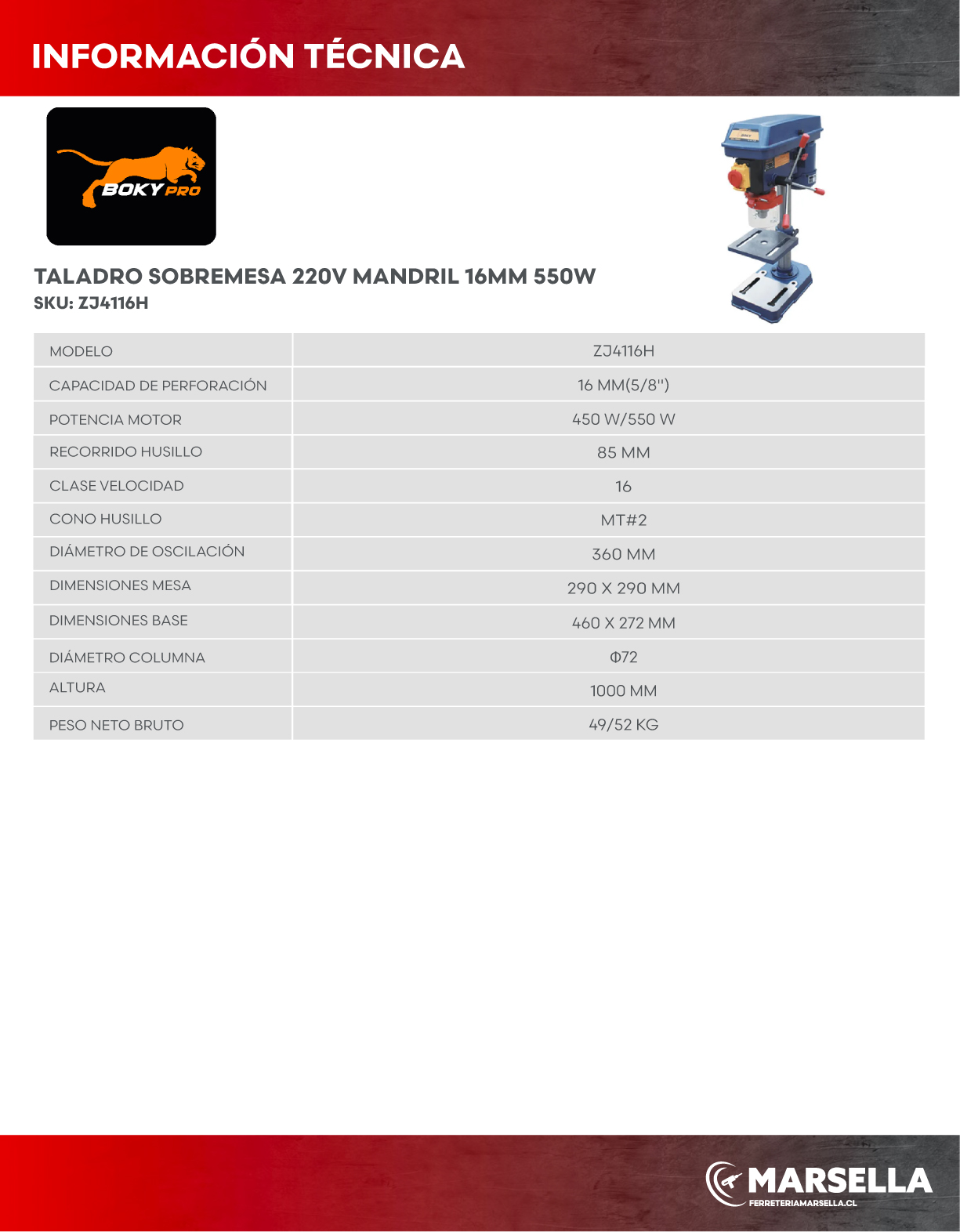 Gracias a su mandril de 16 mm, es compatible con una amplia variedad de brocas, ofreciendo mayor versatilidad para tareas industriales, educativas o de bricolaje. Su estructura metálica y columna rígida aseguran una alineación perfecta y una larga vida útil, incluso en usos prolongados.