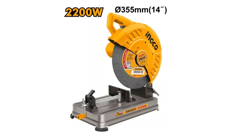 Tronzadora industrial INGCO COS223558, diseñada para corte de metales, tubos, perfiles y varillas en obra y taller. Motor de 2200W, hoja de 14" (355mm x 25,4mm), velocidad sin carga 3700 rpm. Capacidad máxima de corte: 100mm en tubo redondo, 100x100mm cuadrado, 120x100mm rectangular y hasta 50mm en barra maciza. Incluye disco de corte 355mm y protector de disco. Base de acero estable, interruptor de seguridad, mango ergonómico y sistema de sujeción rápida.